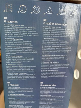 Esterilizador 4 en 1, con cesta para lavavajillas. Esteriliza en 6 minutos y se desconecta automáticamente por seguridad al finalizar. Esteriliza hasta seis biberones de 330 ml. Como nuevo. Precio original 110 euros. Esterilizador de vapor para biberones y accesorios. - Diseño compacto y moderno. - Fácil de usar y limpiar. - Marca: Philips Avent.