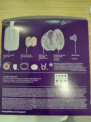 Sacaleches eléctrico Philips Avent, diseñado para ser manos libres y ofrecer comodidad. - Bomba de alta resistencia. - Escudo de silicona SkinSense. - Incluye unidad de motor, clip, taza de recolección, escudo para el pecho de 21/24 mm, inserto de escudo de 19 mm y tarjeta de tallas para pezones. - Incluye biberón de 125 ml / 4 oz y - no incluye 25 bolsas para leche materna de 180 ml / 6 oz.