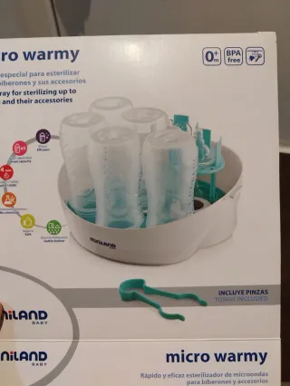 Esterilizador de microondas Miniland Micro Warmy, ideal para biberones y accesorios. Nuevo sin usar y con embalajes originales Medidas del producto Ancho: 25 cm Fondo: 26 cm Alto: 18 cm - Capacidad para esterilizar hasta 6 biberones y sus accesorios. - Esterilización rápida y eficaz en 4 minutos. - Libre de BPA. - Incluye pinzas para una manipulación segura. - Diseño compacto y fácil de usar.