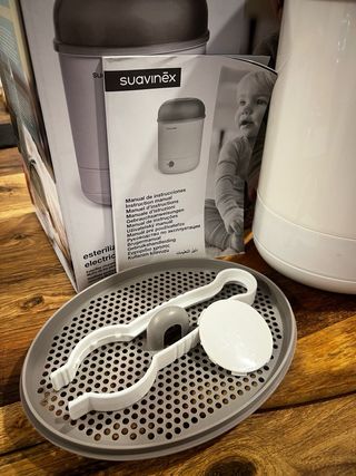 Esterilizador eléctrico Suavinex en color blanco y gris. Incluye todas las piezas. Ha tenido un poco de uso las primeras semanas. Así que está casi nuevo.