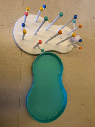Práctico secador de biberones con un diseño moderno y funcional. - Base blanca con borde turquesa. - Múltiples varillas para secar. - Bolas de colores en los extremos de las varillas.