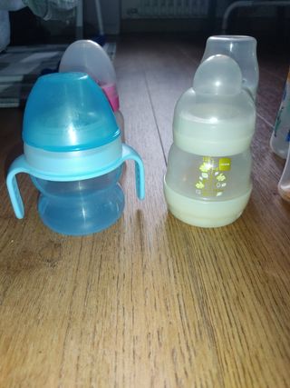 Set de biberones de varias marcas: Avenit (2), Suavinex (2) y Mam (2). Se regalan dos botes de Avenit para papillas y dos tazas para beber de Ikea