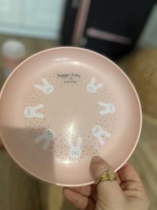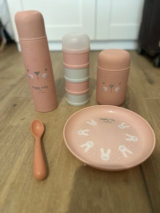 Conjunto de artículos de alimentación para bebé en color rosa, con un diseño tierno de conejitos. - Termo para líquidos con un par de golpes visibles en la foto pero en buen estado general. - Recipiente apilable para leche en polvo. - Tarro para comida. - Plato con diseño de conejitos con algunos cortes del uso. - Cuchara de silicona.
