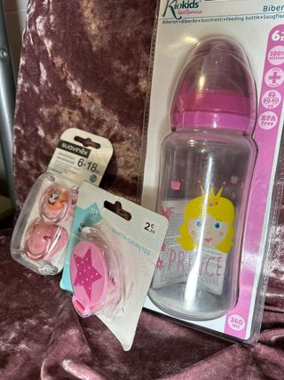Lote de artículos para bebé. - Biberón Kiokids de 360 ml con tetina de silicona 100% y sistema anticólicos. - Dos chupeteros Suavinex anatómicos para bebés de 6-18 meses, uno con diseño de osito y otro con estrella rosa. - Un sujetachupetes TEX con diseño de estrella rosa.