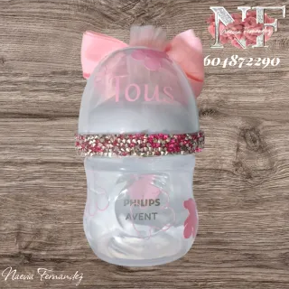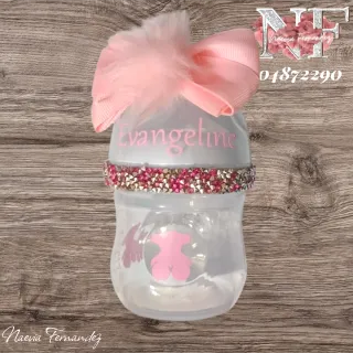 Biberón personalizado con el nombre Evangeline y un diseño de Tous. - Decorado con pedrería. - Incluye un lazo rosa y pompón. - Diseño exclusivo.