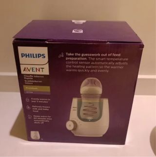 Calentador de biberones de la marca Avent. Diseñado para calentar de forma rápida y uniforme. - Color blanco con detalles en azul. - Panel de control con selector de temperatura.