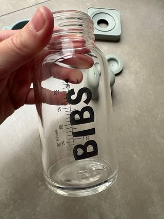 Biberón de cristal de la marca BIBS con capacidad de 110 ml. Diseñado para ofrecer una experiencia cómoda y segura. - Material: Cristal. - Capacidad: 110 ml. - Marca: BIBS (Dinamarca). Incluye varias piezas: 1) tapa para bloqueo de leche que impide que la leche se derrame 2) un embudo plegable para fórmula en polvo y medidas con incrementos estándar. 3) Tapa de cierre Apto para lavavajillas, microondas y congelador (excepto la tetina, no incluída por temas de seguridad/higiene). Sin uso, en perfecto estado.