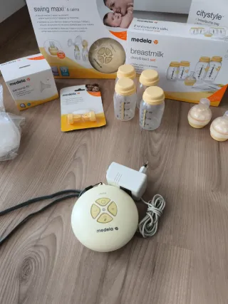Pack de productos Medela para la lactancia. Incluye sacaleches y accesorios. - Sacaleches Swing Maxi & Calma. - Set de alimentación para leche materna. - Bolsa para sacaleches Citystyle. - Protectores de pezón Contact. - Copas extra tamaño S. - Repuesto de membranas sin estrenar. - Recoge leche pezoneras sin estrenar 4 unidades. - Más biberones y tetinas extra a los de la caja. - y de regalo Sacaleches medela eléctrico swing (solo aparato). Funciona perfectamente.