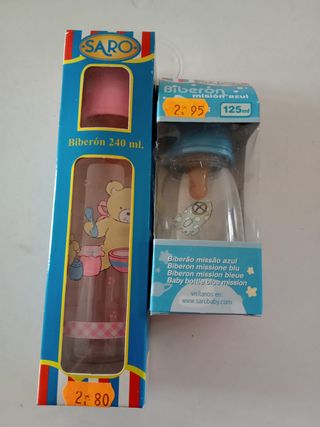 Se venden dos biberones de la marca Saro, uno de 240 ml y otro de 125 ml. - Procedente de cierre de negocio. - Biberón Saro de 240 ml con diseño infantil. - Biberón Saro de 125 ml en color azul. - Aptos para uso infantil.