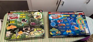 Dos emocionantes circuitos de Magic Tracks, uno temático de jungla y otro Giga Kit. -Las pistas se pueden unir,el azul va con mando y el verde sin,con sonidos,se puede ver en You tuve. - Magic Tracks Jungle Plus con 240 piezas. - Magic Tracks Giga Kit con 320 piezas fluorescentes. - Ambos circuitos incluyen coches con luces. - Anunciados en televisión.20e los dos,no los vendo por separado
