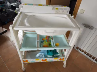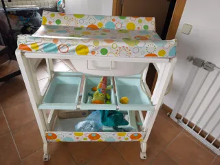 Práctica bañera y cambiador para bebés, con ruedas para facilitar su movilidad. - Diseño funcional con varios compartimentos para guardar lo necesario para el baño del bebé o para cambiarle (pañales, jabón, toallas, etc). - Colchoneta cambiador con estampado de círculos de colores. Tiene un desperfecto, cómo se puede ver en una de las imágenes, pero no afecta a su uso.