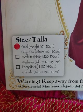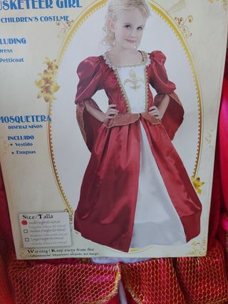 Disfraz de mosquetera para niña, ideal para fiestas o eventos. - Incluye vestido y enaguas. - Talla S (altura 110-120 cm). - Advertencia: Mantener alejado del fuego.