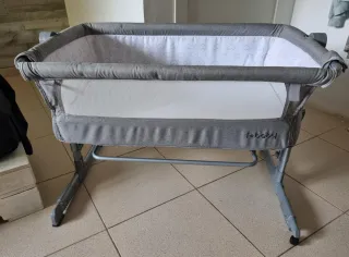 Cuna de colecho en color gris, con un diseño moderno y práctico. - Interior con estampado de nubes. - Laterales con malla transpirable. - Estructura metálica resistente. -Incluye un colchón y funda