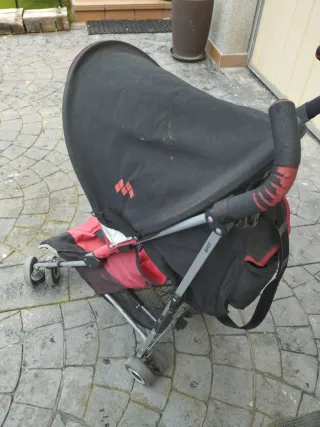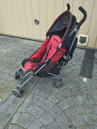 Cochecito de paseo de la marca Maclaren en color rojo y negro. Es ligero y fácil de plegar. - Capota ajustable. - Cesta de almacenamiento inferior. - Ruedas delanteras giratorias.