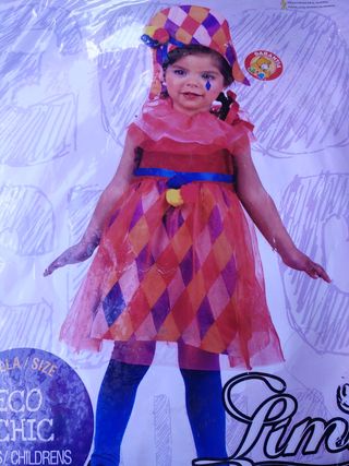Disfraz de arlequín para niña, talla 2 años. Perfecto para fiestas y carnavales. - Diseño de rombos en rojo, naranja y morado. - Incluye sombrero a juego. - Cuello con volantes. - Cinturón azul con pompón amarillo.