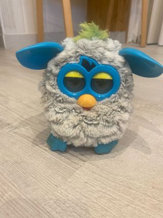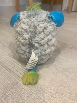 Peluche interactivo Furby con acabado suave. - Color principal gris con detalles en azul. - Ojos grandes y expresivos. - Cresta de pelo verde en la cabeza.