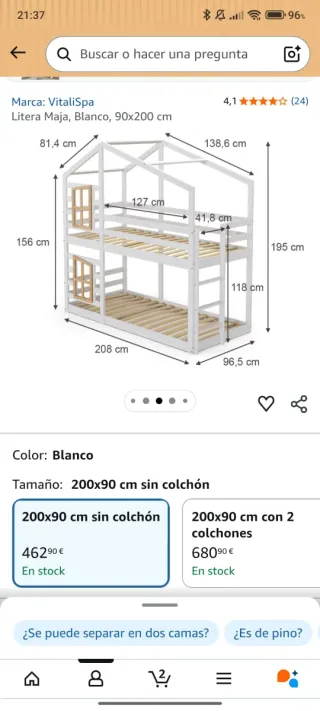Litera estilo casita en color blanco, perfecta para habitaciones infantiles. Sus dimensiones son 90x200 cm. - Diseño con tejado. - Escalera integrada para acceder a la cama superior. - Ventanas decorativas en los laterales.