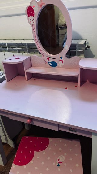 Conjunto de tocador infantil en color rosa, perfecto para juegos. - Tocador con espejo ovalado decorado. - Incluye un taburete a juego. - Diseño con globos y figuras. - Cajón con tirador redondo.