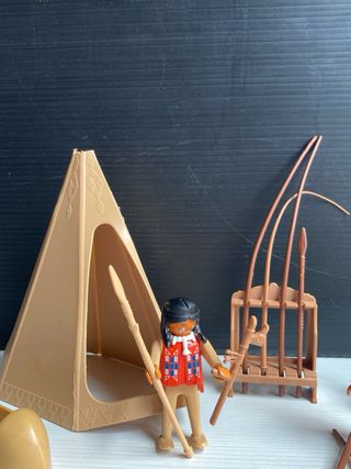 Set de Playmobil de una tribu indígena con varios accesorios. - Incluye una canoa marrón con detalles amarillos. - Tienda de campaña de color beige. - Figuras de personas con vestimenta tradicional. - Accesorios como lanzas, cañas de pescar y una hoguera.