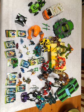 Gran lote de figuras y vehículos de Ben 10. - Incluye personajes icónicos. - Varios vehículos temáticos. - Accesorios variados.