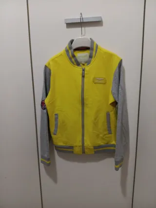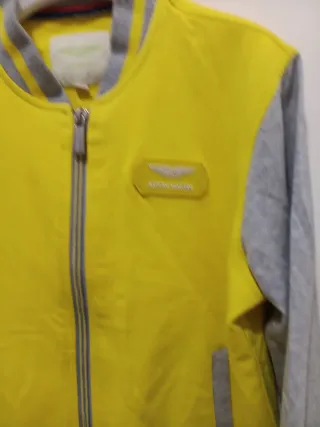 Chaqueta estilo bomber de Aston Martin para niño. - Color amarillo y gris. - Talla 7. - Cierre de cremallera. - Puños y cintura elásticos. - Hombros 34 Largo 47 tripita 37.