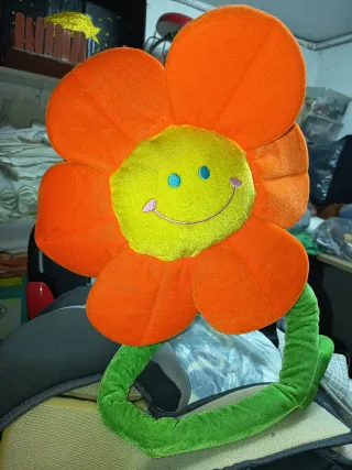 Adorable peluche con forma de flor sonriente. - Color naranja vibrante en los pétalos. - Centro amarillo con carita feliz. - Tallo verde flexible.