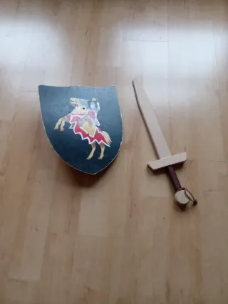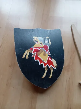 Set de juego de madera. - Escudo con diseño de caballero a caballo. - Espada de madera.