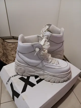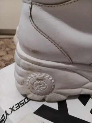 Zapatillas de plataforma de estilo buffalo. - Diseño de caña alta. - Cierre con cordones. - Suela gruesa y robusta. - Blancas. - Talla 38 - En una de las sueñas hay un defecto. Esta como recortada una parte de suela. Cómo se produjo? Al lavarlos en la lavadora, se originó con el roce del tambor de la lavadora muestro la foto. Puestas no se aprecia.