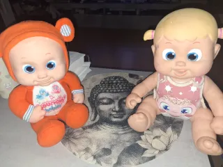 Se venden dos muñecos bebé. - Uno con traje naranja y orejas. - Otro con traje rosa y pelo rubio. - Bouncin babies, abre la boca al aprelarle la barriga y suena una canción. - Beautyphun, tiene mancha de rotulador en la cara. - Medida 29 y 30 cms.