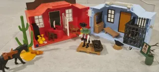 Set de Playmobil que incluye una oficina de sheriff y una sucursal bancaria. - Edificio del sheriff en color rojo. - Edificio del banco en color azul. - Incluye figuras y accesorios temáticos del oeste.