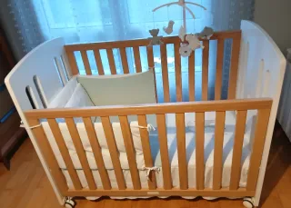 Cuna de madera con colchón para bebé - Madera y blanco - 3 posiciones para el somier y cambiar la altura del colchón - Barrera de protección lateral para subir y bajar - Ruedas para mover con facilidad, y frenos - Protector antimordeduras - Incluye colchón (en perfecto estado) REGALO: Almohada y protector de colchón