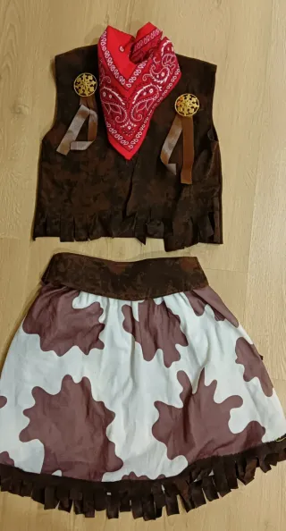 Conjunto de disfraz de vaquera para niña. Talla 4-6 - Chaleco marrón con detalles dorados y cintas. - Pañuelo rojo con estampado blanco. - Falda con estampado de vaca y flecos marrones. - Cinto