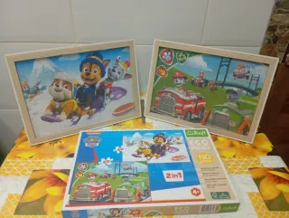 Dos puzzles de la Patrulla Canina de la marca Trefl, modelo 2 en 1. - Incluye dos imágenes diferentes de la Patrulla Canina. - Cada puzzle tiene 60 piezas. - Fabricados con materiales ecológicos. Se venden enmarcados y listos para decorar. Muy bonitos para dormitorios infantiles tanto colgar como colocar en una balda. Se hace precio por lotes. Pregunta sin compromiso.