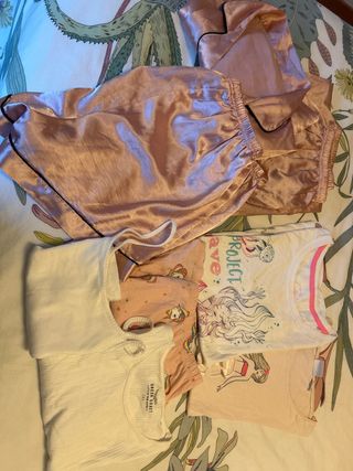 Lote de ropa para adolescente, talla 14 años. Incluye pijamas y camisetas. - Pijama de satén rosa con ribete negro, compuesto de una parte de arriba y dos pantalones , uno corto y uno largo. - Camiseta blanca de manga corta con textura. - Pantalón de pijama corto rosa con estampado de unicornios. - Camiseta blanca con estampado de sirenas y texto Project Wave. - Camiseta rosa con estampado de chica surfeando.