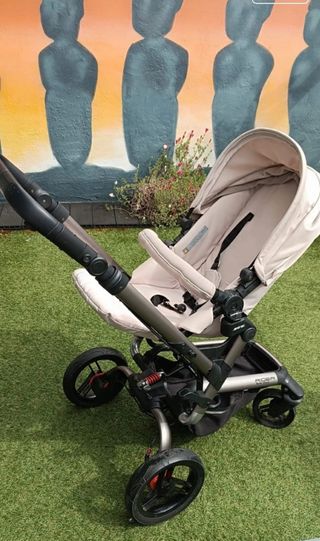Carrito de bebé de la marca Jané en color beige. Un cochecito cómodo y funcional. - Diseño moderno y elegante. - Asiento acolchado. - Capota ajustable. - Ruedas todoterreno.