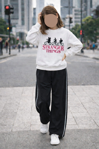 Tallas: 4a / 6a / 10a 👕 Sudadera afelpada, suave al tacto, con estampado frontal inspirado en la serie Stranger Things.🚴♂️ 👖 Pantalón cómodo de corte recto, con detalle lateral en contraste.