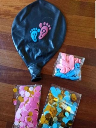 Globo para la revelación del sexo del bebé. Incluye bolsa de confetis azul, bolsa de confetis rosa y 10 unidades de globos 5 azul y 5 rosa para atar al globo negro y decorarlo.