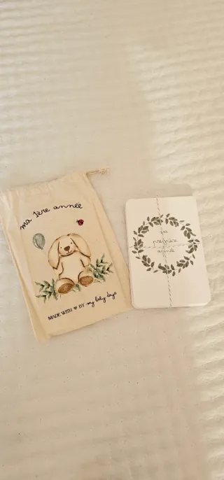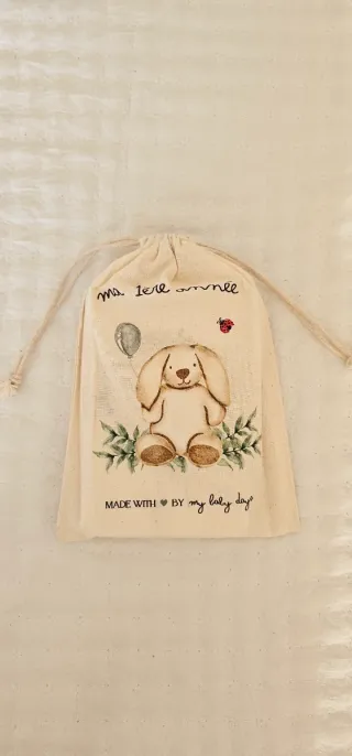 Bolsa de tela con un tierno diseño de conejito, globo y mariquita. Ideal para celebrar el primer año. - Ilustración pintada a mano. - Frase Ma 1ere Annee y MADE WITH ❤️ BY my baby days. - Estan en Frances.