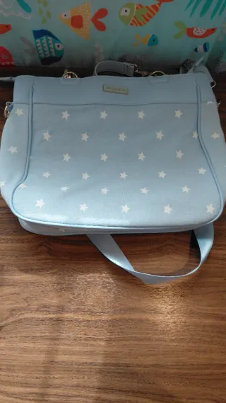 Buen estado, poco uso. Bolso de tela para carrito de bebé de la marca Mayoral. Es de color azul claro y tiene un diseño moderno. - Compartimento principal con cierre de cremallera. - Bolsillo frontal con cremallera. - Asas para llevar en la mano. - Incluye un pequeño detalle bordado en el bolsillo frontal.