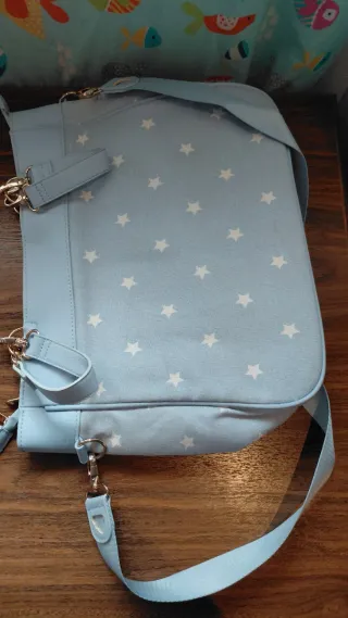 Bolso cambiador de bebé en color azul claro, con un diseño moderno y práctico. - Compartimentos exteriores con pliegues. - Detalle de osito colgante. - Asas de mano y correa ajustable para hombro. A parte tiene también dos enganches para el carro de velcro Está como nuevo, sin uso