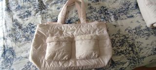 Precioso bolso cambiador de la marca Pasito a Pasito, en color beige. Es ligero y de tamaño perfecto para llevar lo esencial del bebé. - Está en muy buen estado. - Cierre de cordón. - Asa de mano.