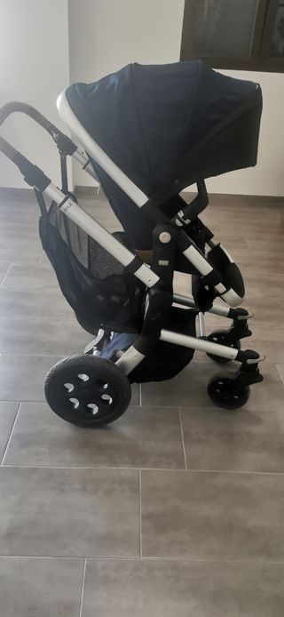 Bugaboo Camaleon 1 con las bases color gris oscuro y complementos en rosa. NO TIENE CAPAZO sólo sillita, capota extensible y ruedas Todoterreno. Se regala bolso y neceser de mayoral. El mango al bajar y subir escaleras se extiende por haber dado de sí. Pero el carro funciona perfectamente. El chasis tiene rozaduras por el uso y la sillita alguna mancha que apenas se nota. Se puede ver sin compromiso.