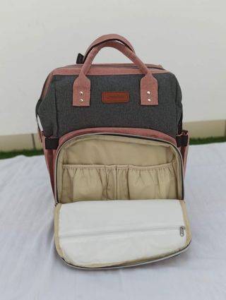 Mochila nueva, a estrenar!! Versátil/multifunción: bolsa de pañales, mochila, cambiador, cuna... Color gris/rosa. Tela impermeable. - Gran capacidad, con 14 bolsillos, entre ellos 2 bolsillos térmicos. - Dispone de 2 ganchos para colgar del cochecito del bebé. - Posee 1 puerto USB y cable. - Volumen 27l.