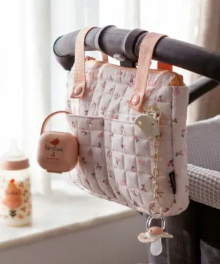 Bolso de carrito para bebé de la marca MiMuselina en color rosa. - Diseño con tejido tipo gofre. - Bolsillos exteriores. - Correa ajustable con botones a presión.