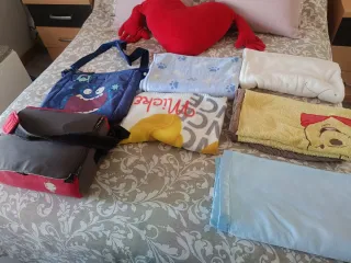 Conjunto de artículos variados para bebé. - Bolso TUC TUC azul con estampado. - Trona de viaje JANE Manta toalla blanca con diseño de oso. - Manta toalla azul con huellas. - Manta Toalla amarilla con Winnie the Pooh. - Manta con diseño de Mickey Mouse. - Manta azul claro.