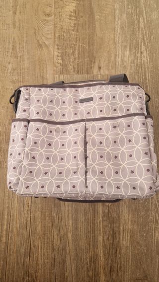 Bolso para carrito de bebé de la marca Tuc Tuc con un divertido estampado de estrellas. - Color gris con estrellas negras. - Asas de mano y correa para colgar. - Múltiples bolsillos exteriores. - se nota algún cambio de color en algunas zonas de haber estado al sol. Ver foros - lleva los enganches para colgar del carro Aproximadamente 34 cm de ancho x 30 de alto