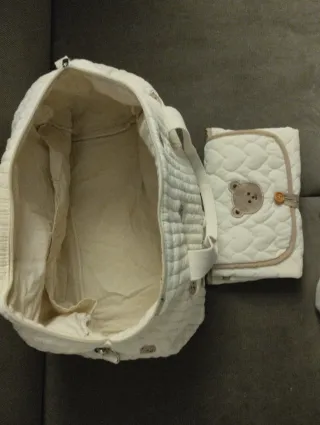 Preciosa bolsa para bebé de la marca Pirulos, en color blanco roto. Incluye un cambiador a juego. - Diseño elegante y práctico. - Perfecto estado. - Ideal para llevar todo lo necesario para el bebé.