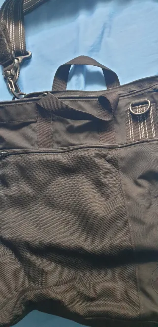 Bolso negro de tela, ideal para llevar en el cochecito de bebé. Es práctico y espacioso. - Compartimento principal con cremallera. - Bolsillo frontal con cremallera. - Asas de mano y correa ajustable para colgar. - Bolsillo lateral de malla.