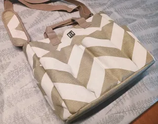 Preciosa bolsa de maternidad Tuctuc, ideal para llevar todo lo necesario para el bebé. Está en muy buen estado y tiene un diseño colorido y alegre. - Asa de mano y asa larga para colgar al hombro. - Compartimento principal amplio y dos bolsillos interiores. - Diseño con estampado de zigzag multicolor.