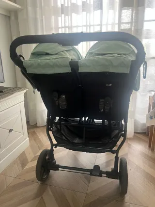 Carro gemelar Niu Vent Twin en color negro y capotas verde menta. - Dos asientos independientes. - Capotas con protección solar. - Arnés de seguridad de 5 puntos. - Reposapiés acolchado. - Cesta de almacenamiento inferior. INCLUYE PROTECTOR DE LLUVIA Y UN KIT DE RUEDAS NUEVAS EN BOLSA